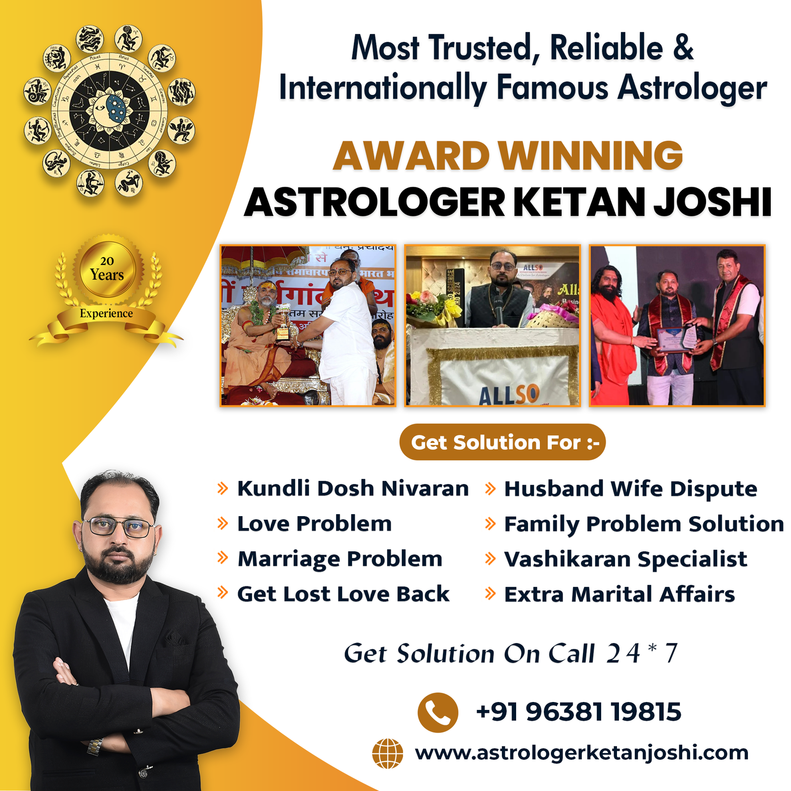 He is master of Vashikaran, Love Vashikaran, Black Magic, Black Magic Removal and Love Problem and capable of solving problems which you are facing in your life. Astrologer Ketan Joshi is a Famous Astrologer located at Ahmedabad, Gujarat, INDIA. Astrologer Ketan Joshi ji is the specialist of Astrology, Vashikaran, Black Magic, Lost Love Back and Love problem solution. He spread his service in all over the world UK, USA, Australia, India, America, Canada, New Zealand, and many other countries.
